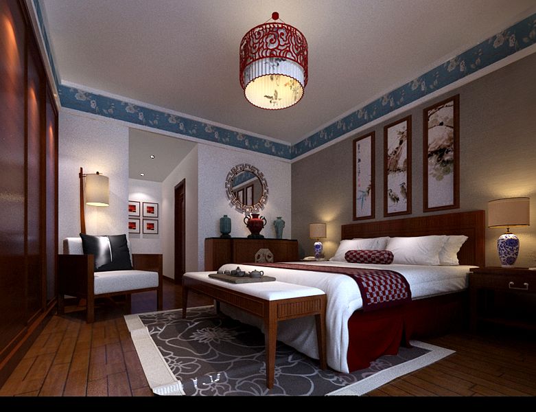 中式的字畫點(diǎn)綴于臥室床頭背景墻上,富有品味。