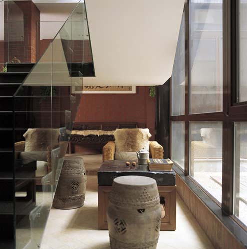 中式的石墩、方桌和法式的藤椅在這個簡潔、明快的角落里不期而遇。