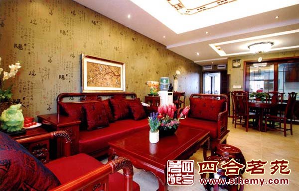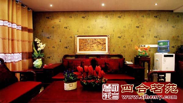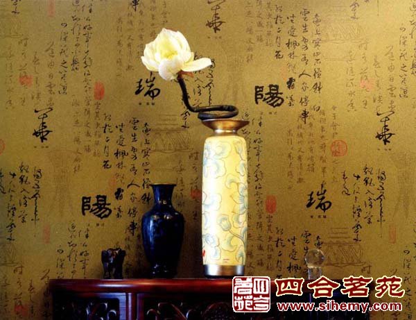 色彩深淺高低不同的兩個花瓶以及蜿蜒一只獨秀的花朵在古字壁紙的襯托下更有意味。