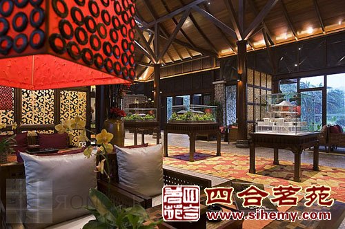 沒有奢華的描金彩繪但是傳統的木結構和中式的花格燈飾自然之美更加吸引觀者的目光,設計色彩簡單但不單調奢華的氣氛充盈了整個空間。