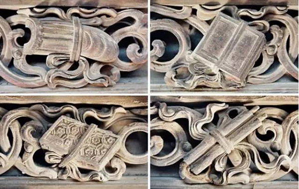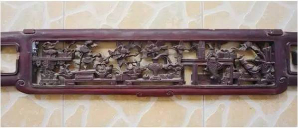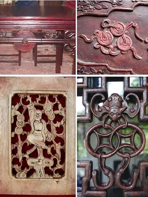 是古代的鑄幣。古錢與蝙蝠圖,叫“福在眼前”;古錢與喜字謂之“喜在眼前”;“金玉滿堂”為古樹枝上掛古錢。錢,古稱泉,泉與全同意,因此,蝙蝠銜著用繩穿起來的兩枚古錢,稱“福壽雙全”。古錢的形意圖樣多表現在條桌和八仙桌的圍板雕刻中。